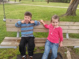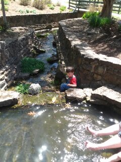 The creek is what gets me into trouble with the other moms, I'm afraid. You see, I let my kids wade in the water. As far as I can tell, it's not prohibited. The moat is only a few inches deep and very accessible, very much a part of the playscape, you know? It's right in the middle. It is begging to be splashed in. And it is part of why my kids love to come here. We come planning for wet feet (except for Tess, who always manages to get wet to her neck).
